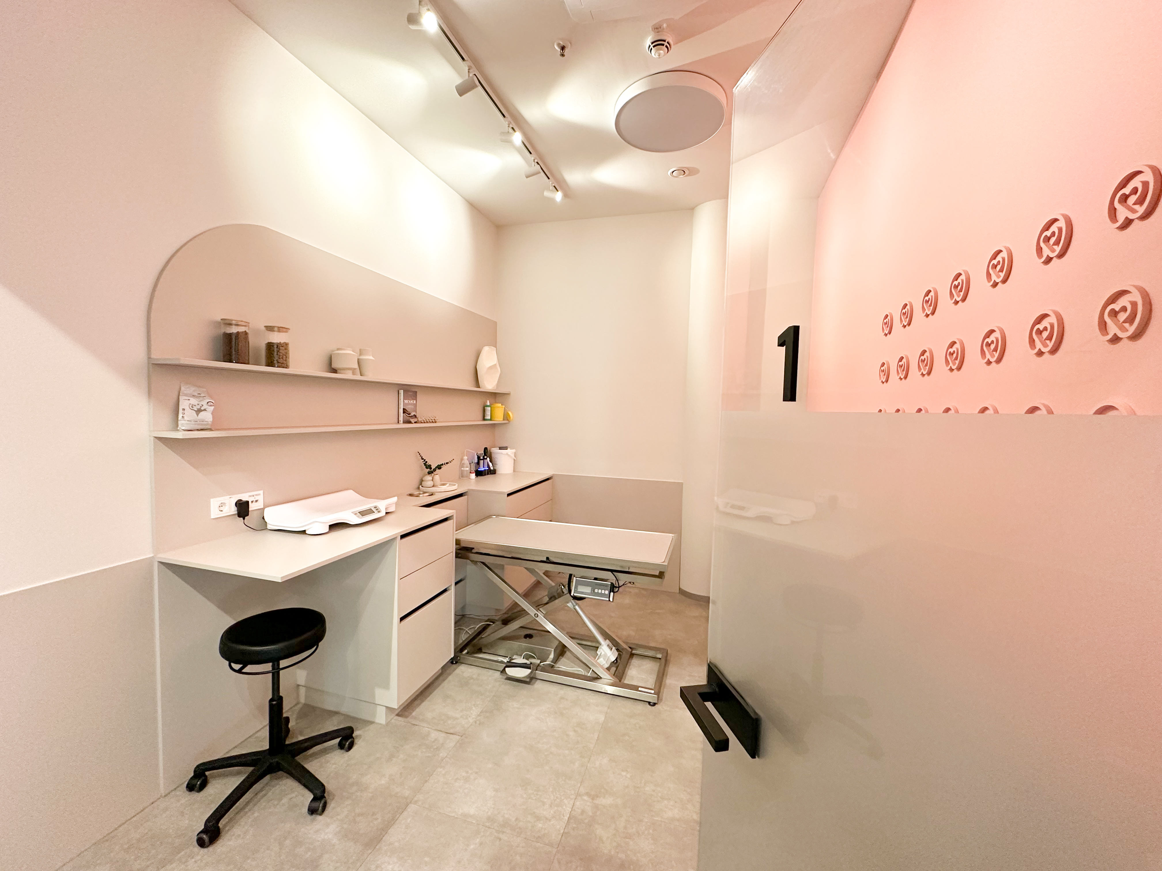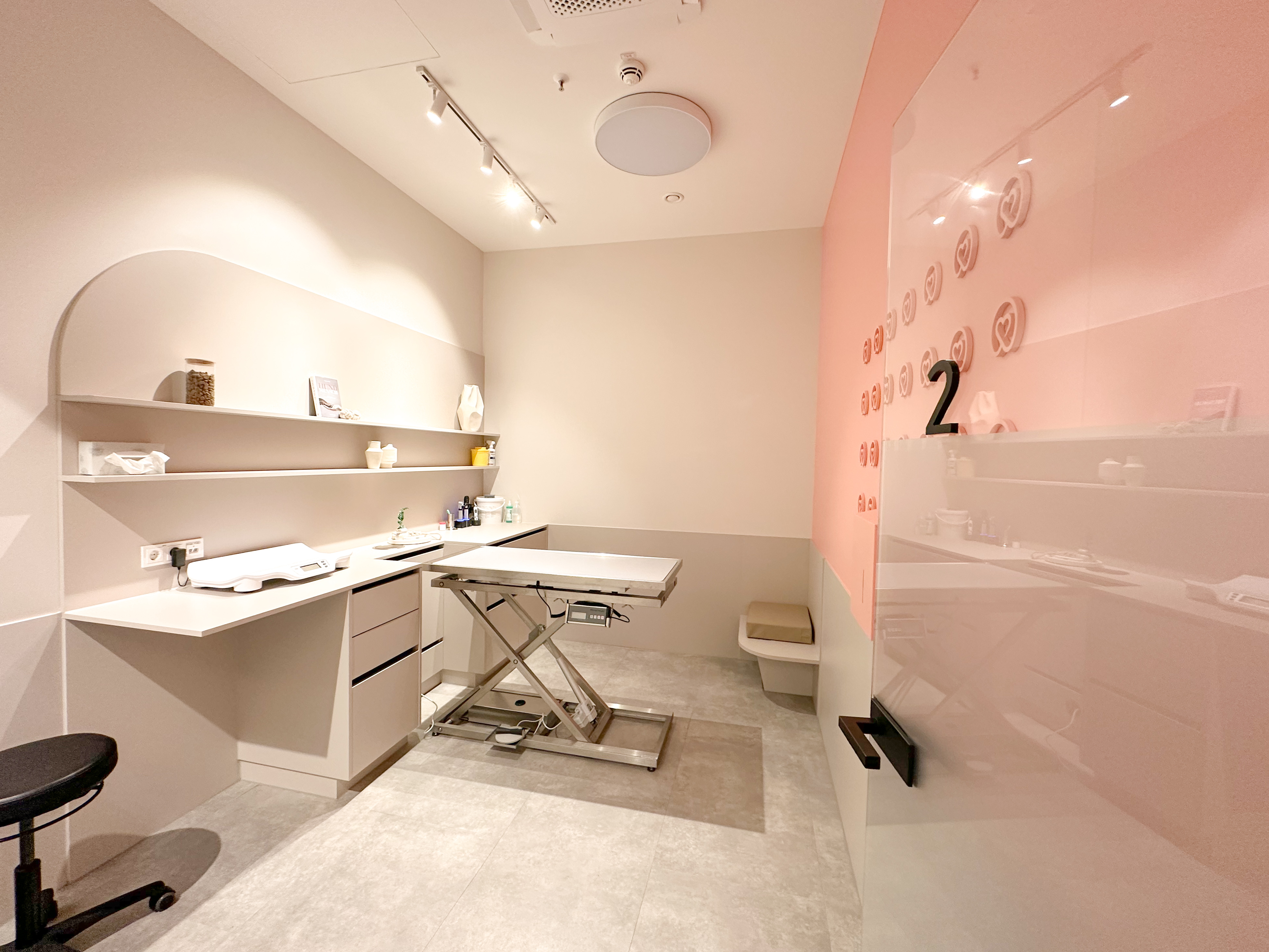 Die Praxis verfügt über fünf Behandlungszimmer, darunter ein separates Katzenzimmer sowie getrennte Wartebereiche für Hunde und Katzen. Neben Weichteil- und Dental-OP-Räumen (inkl. Dentalröntgen) sind ein Behandlungsareal für OP-Vorbereitungen, digitales Röntgen, ein kardiofähiges Ultraschallgerät und ein Inhouse-Labor für Blut-, Urin-, Kot- und Zytologieanalysen ebenso Teil der Ausstattung wie eine Apotheke und die Möglichkeit zur stationären Tagesaufnahme. Als gemütlicher Aufenthaltsraum steht Mitarbeitenden eine gut ausgestattete geräumige Küche mit Esstisch und Sofaecke zur Verfügung – inklusive Müslibar, Kaffee, Wasser und Obst. Büroflächen für Praxismanagement und ein Vet Office runden das Setup ab.